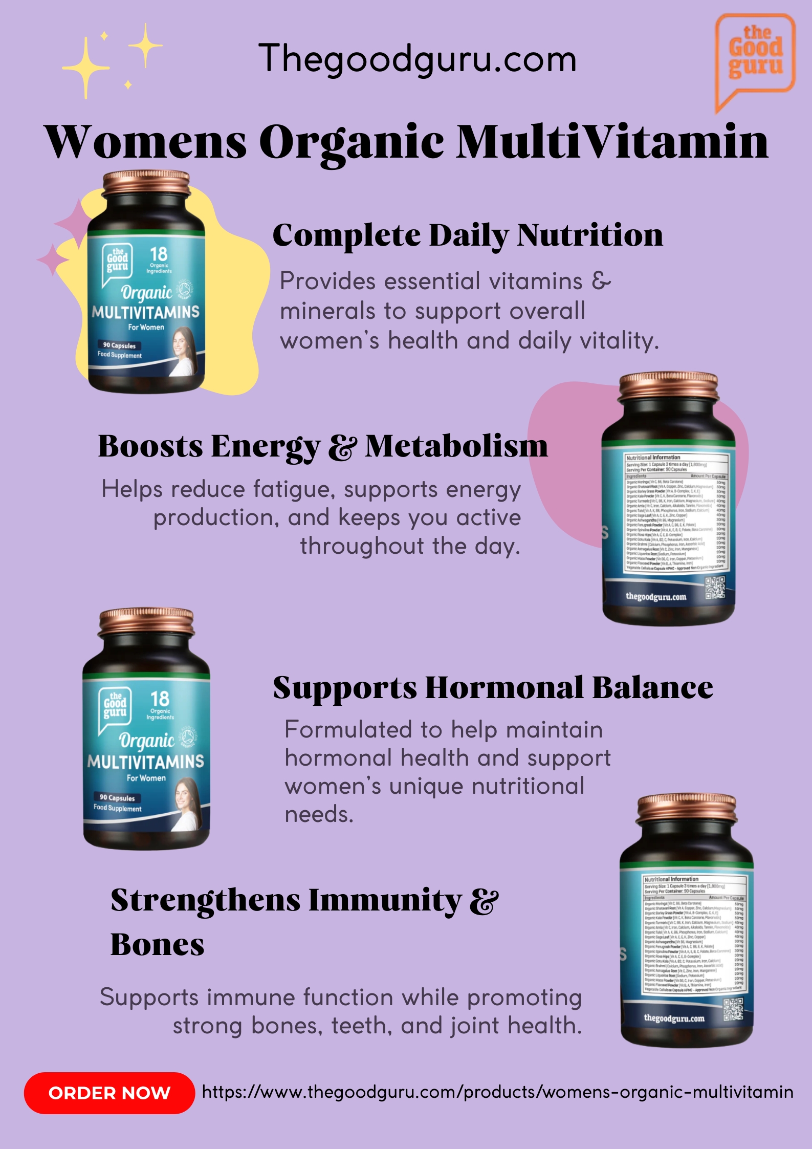 Women’s Daily Organic Multivitamin by The Good Guru is a plant-based, certified organic formula designed to support women’s energy, immunity, hormonal balance, and overall wellness with clean, vegan ingredients and no synthetic additives.
